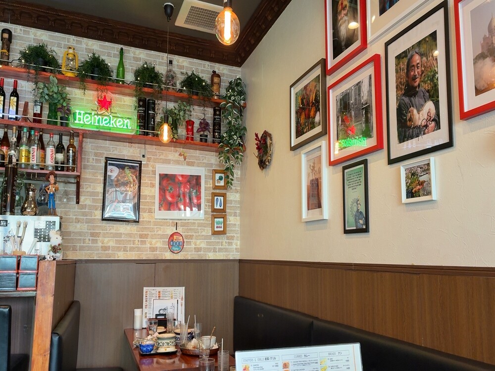 店内に足を踏み入れると、レンガ調の壁にHeinekenのネオンサインが目を引きます。壁にはカラフルな写真が飾られていて、異国情緒とカジュアルさがうまく同居した空間でした。テーブル28席にカウンター3席の計31席で、ソファー席もあるためゆったりとくつろげます。