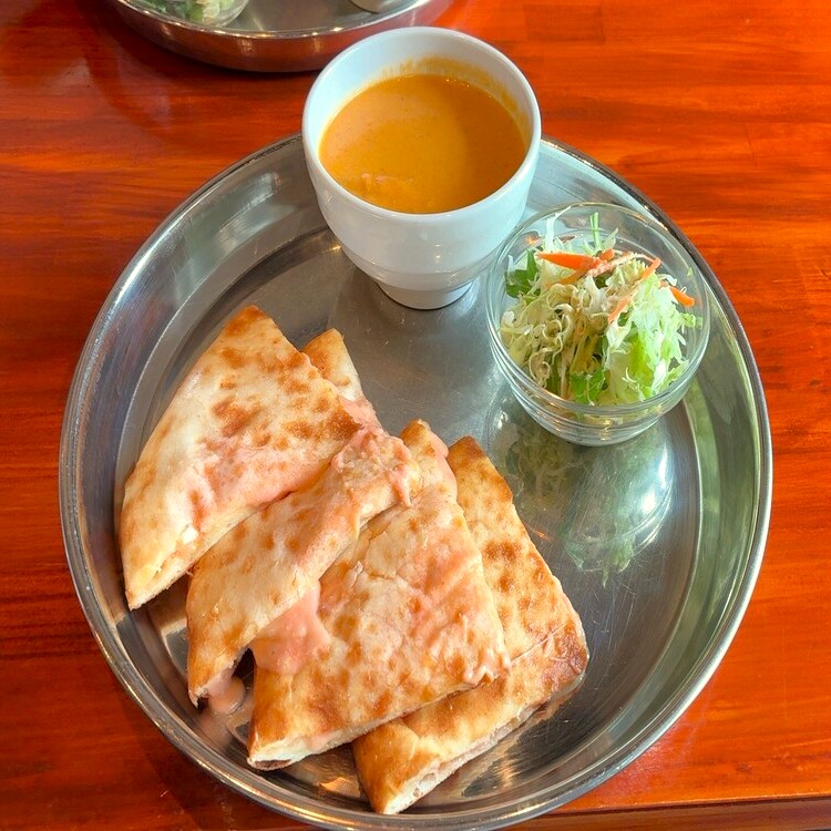 銀のプレートにのった明太チーズナンは、折りたたまれた状態で登場。ひと口かじると、とろけるチーズの中に明太子のプチプチとした食感が広がります。ココナッツ海老カレーにつけて食べてももちろんおいしいのですが、ナンだけでも十分満足できる仕上がりでした。