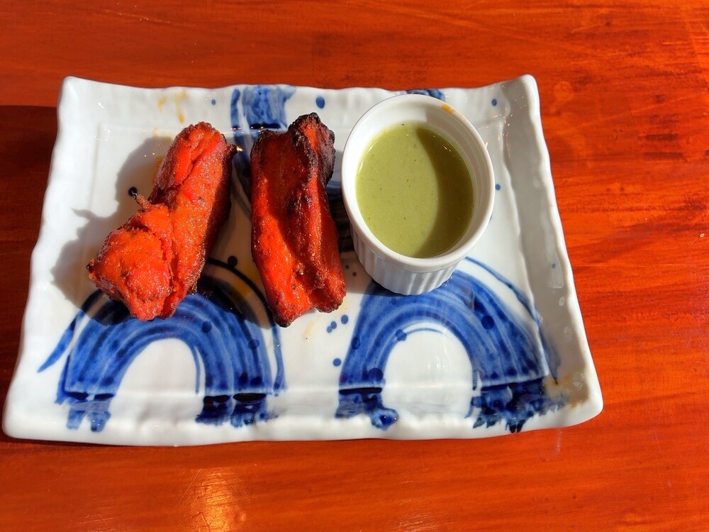 続いて、タンドール料理のチキンティッカ。鮮やかな赤色に焼き上がったチキンが、和柄のお皿にのって運ばれてきます。添えられた緑のミントソースをつけると、さわやかな風味が加わって味の印象ががらりと変わりました。