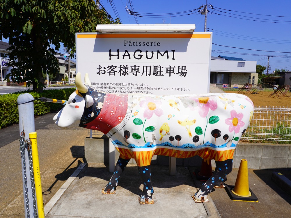 お店の専用駐車場に近づくと、牛のオブジェがお出迎え。