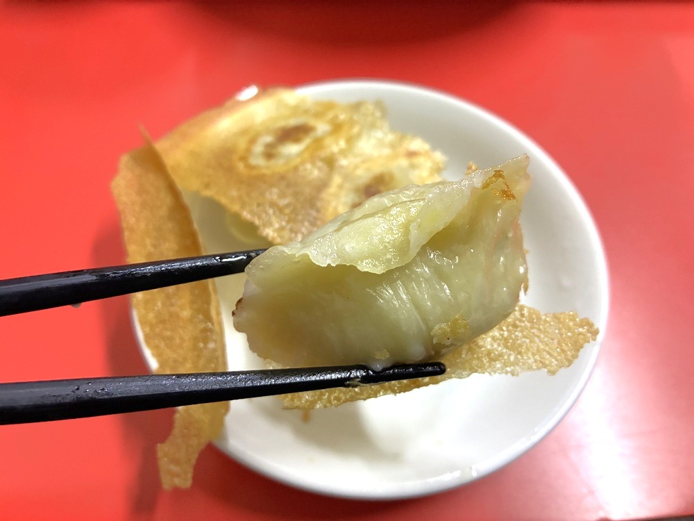 続いて餃子。こちらはパリッとした羽根つきで、箸で持ち上げるときれいな焼き色が食欲をそそりますね。一口かじると、もちもちの皮の中からジューシーな肉汁があふれ出てきました。皮の食感と具材の旨みのバランスがよく、何個でも食べたくなるおいしさです。