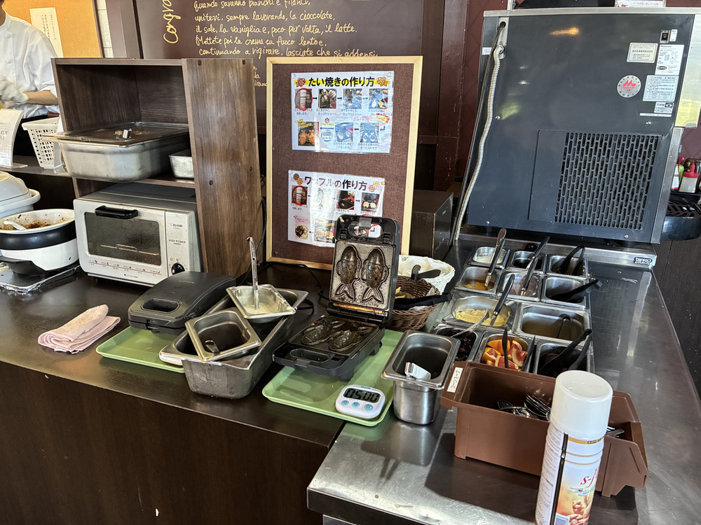 デザートコーナーも見逃せません。松戸店では、たい焼きやワッフルを自分で焼いて楽しめるんです。