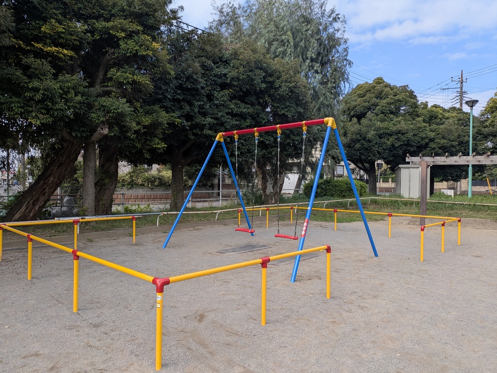 子ども向け遊具は、すべり台やうんていなどが一体となった複合遊具、ブランコ、鉄棒、砂場があります。