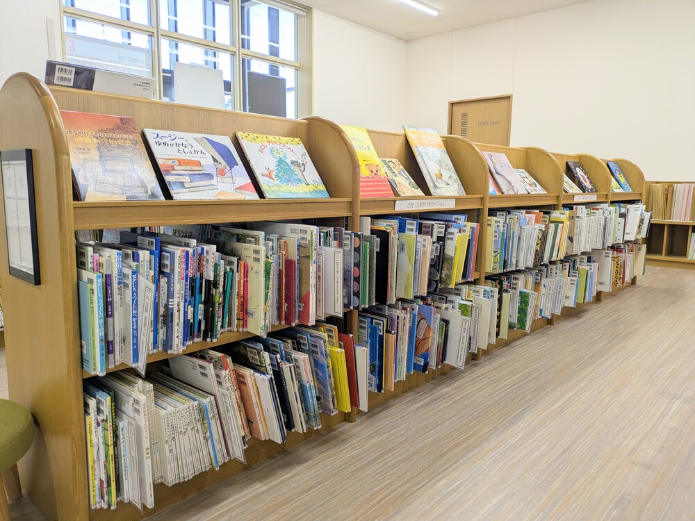 絵本の可愛い表紙が面出し(本の表紙が見えるように展示すること)されています。こちらの図書館に来ると、うちの子どもは面出しされている絵本を中心に選んでいます。